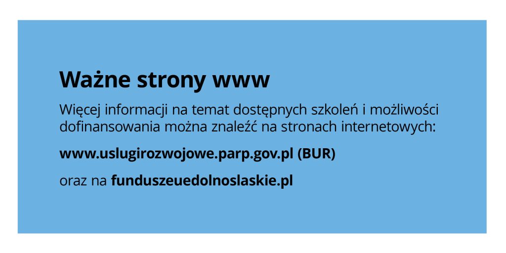 Przedsiębiorcy z Dolnego Śląska już teraz mają możliwość skorzystania z różnorodnych szkoleń dostępnych na platformie BUR, które pomogą w zwiększeniu konkurencyjności firmy oraz rozwinięciu kompetencji ich zespołów. Każdy znajdzie coś dla siebie. Wśród dostępnych tysięcy usług można znaleźć między innymi setki różnych kursów np. językowych, technicznych, komputerowych, a także szkolenia bardziej specjalistyczne, takie jak zarządzanie projektami, finansami, kadrą, warsztaty z marketingu cyfrowego, itp.